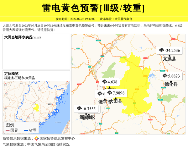 大田县气象台2022年07月28日19时12分继续发布雷电黄色预警信号:预计未来6小时我县有雷电活动,局地伴有短时强降水、6-8级雷雨大风等强对流天气。请注意防范! 信息来源:国家预警信息发布中心; 发布单位:大田县气象台。
