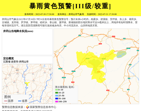 井冈山市气象台2022年07月30日17时38分发布暴雨黄色预警信号:预计未来6小时内,柏露乡、碧溪镇、茨坪镇、东上乡、葛田乡、古城镇、龙市镇、罗浮镇、茅坪镇、睦村乡、拿山镇、厦坪镇、新城镇的部分地区降水可达50毫米以上,局地伴有短时强降水、雷电等强对流天气,请注意防范强降雨可能引发的城乡内涝、中小河流洪水、山洪和地质灾害。 信息来源:国家预警信息发布中心; 发布单位:井冈山市气象局。