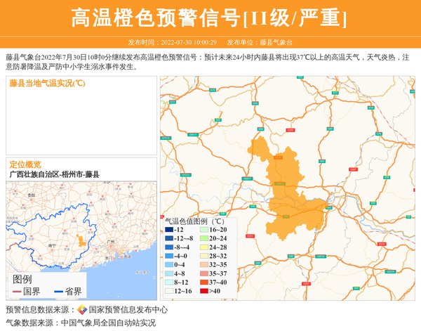 藤县气象台2022年7月30日10时0分继续发布高温橙色预警信号:预计未来24小时内藤县将出现37℃以上的高温天气,天气炎热,注意防暑降温及严防中小学生溺水事件发生。 信息来源:国家预警信息发布中心; 发布单位:藤县气象台。