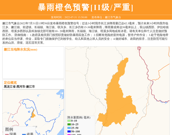 嫩江市气象台2022年7月31日13时50分发布暴雨橙色预警信号:过去3小时我市长江乡降雨量已达42.3毫米,预计未来3小时内我市临江乡、嫩江镇、前进镇、长福镇、海江镇、联兴乡、长江乡仍有15-30毫米降雨,降雨量或将达50毫米以上,双山镇西部、伊拉哈镇西部、塔溪乡西部以及科洛镇北部可能有10~ 20毫米降雨,长福镇、海江镇、塔溪乡局地或有冰雹。请有关单位和个人注意做好预防工作。防御指南:1.政府及相关部门按照职责做好防暴雨应急工作;2.切断有危险的室外电源,暂停户外作业;3.处于危险地带的单位应当停课、停业,采取专门措施保护已到校学生、幼儿和其他上班人员的安全;4.做好城市、农田的排涝,注意防范可能引发的山洪、滑坡、泥石流等灾害。 信息来源:国家预警信息发布中心; 发布单位:嫩江市气象台。
