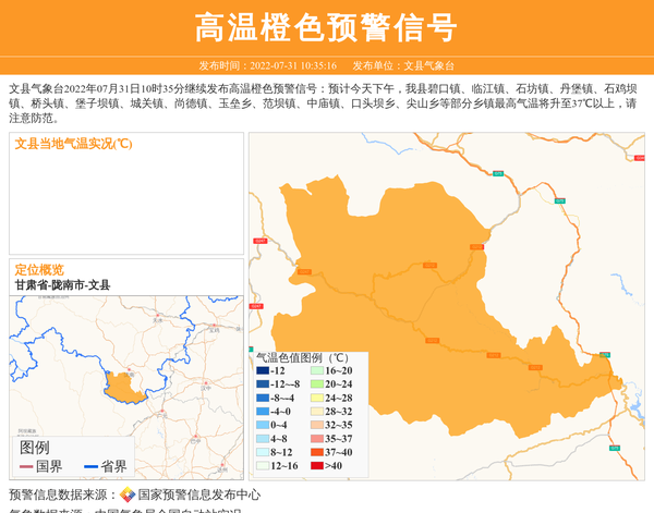 文县气象台2022年07月31日10时35分继续发布高温橙色预警信号:预计今天下午,我县碧口镇、临江镇、石坊镇、丹堡镇、石鸡坝镇、桥头镇、堡子坝镇、城关镇、尚德镇、玉垒乡、范坝镇、中庙镇、口头坝乡、尖山乡等部分乡镇最高气温将升至37℃以上,请注意防范。 信息来源:国家预警信息发布中心; 发布单位:文县气象台。