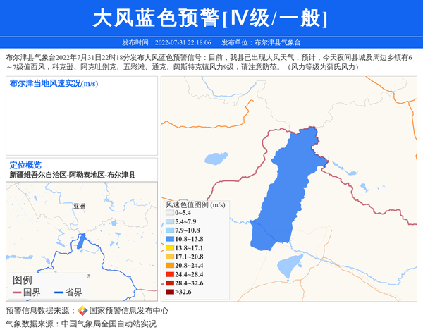 布尔津县气象台2022年7月31日22时18分发布大风蓝色预警信号:目前,我县已出现大风天气,预计,今天夜间县城及周边乡镇有6~7级偏西风,科克逊、阿克吐别克、五彩滩、通克、阔斯特克镇风力9级,请注意防范。(风力等级为蒲氏风力) 信息来源:国家预警信息发布中心; 发布单位:布尔津县气象台。