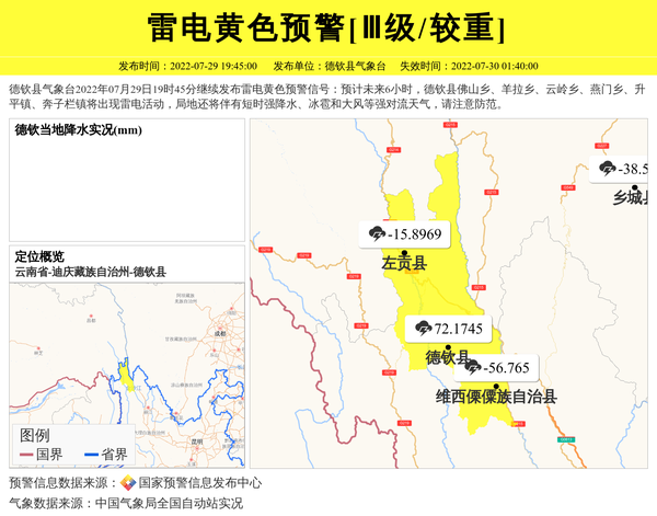 德钦县气象台2022年07月29日19时45分继续发布雷电黄色预警信号:预计未来6小时,德钦县佛山乡、羊拉乡、云岭乡、燕门乡、升平镇、奔子栏镇将出现雷电活动,局地还将伴有短时强降水、冰雹和大风等强对流天气,请注意防范。 信息来源:国家预警信息发布中心; 发布单位:德钦县气象台。