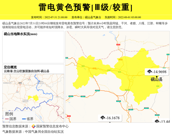 砚山县气象台2022年7月31日21时08分继续发布雷电黄色预警信号:预计未来6小时我县阿猛、干河、者腊、八嘎、江那、蚌蛾等乡镇将陆续出现雷电活动,并可能伴有短时强降水、冰雹、瞬时大风等强对流天气,请注意防范。 信息来源:国家预警信息发布中心; 发布单位:砚山县气象台。