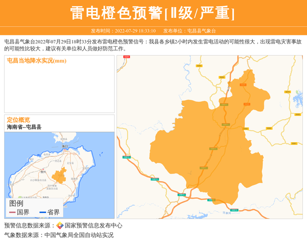 屯昌县气象台2022年07月29日18时33分发布雷电橙色预警信号:我县各乡镇2小时内发生雷电活动的可能性很大,出现雷电灾害事故的可能性比较大,建议有关单位和人员做好防范工作。 信息来源:国家预警信息发布中心; 发布单位:屯昌县气象台。