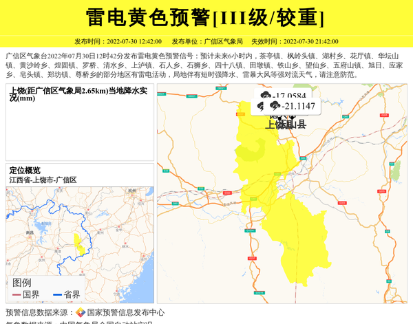 广信区气象台2022年07月30日12时42分发布雷电黄色预警信号:预计未来6小时内,茶亭镇、枫岭头镇、湖村乡、花厅镇、华坛山镇、黄沙岭乡、煌固镇、罗桥、清水乡、上泸镇、石人乡、石狮乡、四十八镇、田墩镇、铁山乡、望仙乡、五府山镇、旭日、应家乡、皂头镇、郑坊镇、尊桥乡的部分地区有雷电活动,局地伴有短时强降水、雷暴大风等强对流天气,请注意防范。 信息来源:国家预警信息发布中心; 发布单位:广信区气象局。