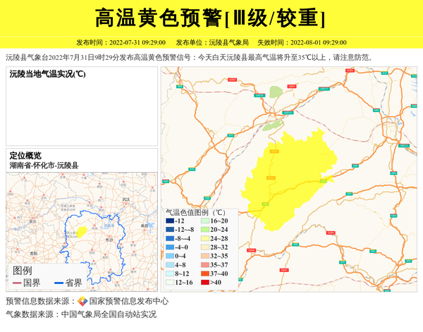 沅陵县气象台2022年7月31日9时29分发布高温黄色预警信号:今天白天沅陵县最高气温将升至35℃以上,请注意防范。 信息来源:国家预警信息发布中心; 发布单位:沅陵县气象局。