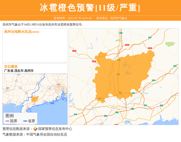高州市气象台于30日13时55分发布高州市冰雹橙色预警信号。 信息来源:国家预警信息发布中心; 发布单位:高州市气象台。