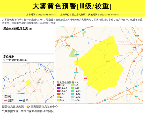 大雾黄色预警信号:预计未来1到2小时,黑山县将出现能见度小于500米的大雾天气,并将持续2到3小时,请户外出行、驾驶车辆注意安全。黑山县气象台2022年7月31日4时28分发布 信息来源:国家预警信息发布中心; 发布单位:黑山县气象局。