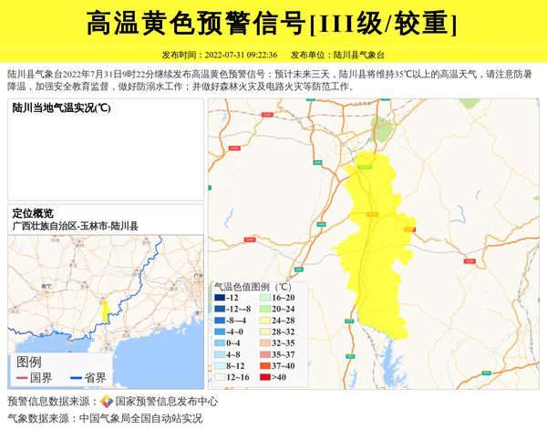 陆川县气象台2022年7月31日9时22分继续发布高温黄色预警信号:预计未来三天,陆川县将维持35℃以上的高温天气,请注意防暑降温,加强安全教育监督,做好防溺水工作;并做好森林火灾及电路火灾等防范工作。 信息来源:国家预警信息发布中心; 发布单位:陆川县气象台。