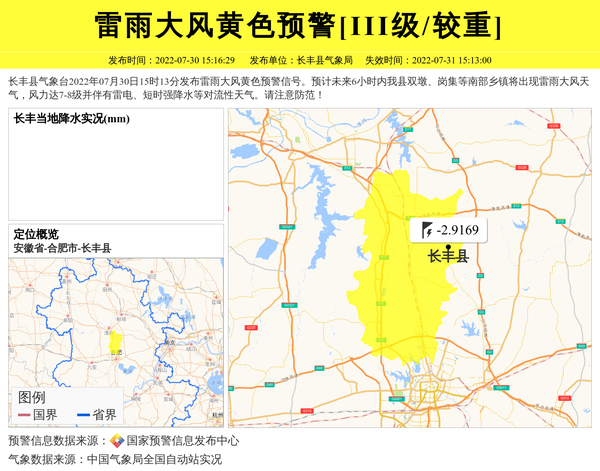 长丰县气象台2022年07月30日15时13分发布雷雨大风黄色预警信号。预计未来6小时内我县双墩、岗集等南部乡镇将出现雷雨大风天气,风力达7-8级并伴有雷电、短时强降水等对流性天气。请注意防范! 信息来源:国家预警信息发布中心; 发布单位:长丰县气象局。