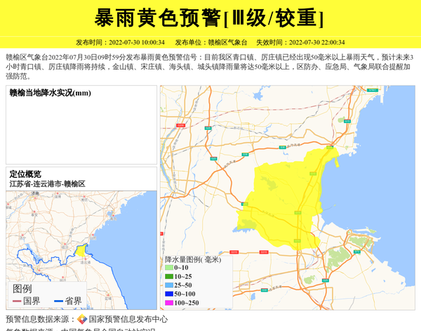 赣榆区气象台2022年07月30日09时59分发布暴雨黄色预警信号:目前我区青口镇、厉庄镇已经出现50毫米以上暴雨天气,预计未来3小时青口镇、厉庄镇降雨将持续,金山镇、宋庄镇、海头镇、城头镇降雨量将达50毫米以上,区防办、应急局、气象局联合提醒加强防范。 信息来源:国家预警信息发布中心; 发布单位:赣榆区气象台。
