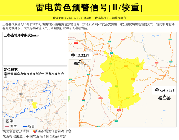 三都县气象台7月30日21时28分继续发布雷电黄色预警信号:预计未来3小时我县大河镇、都江镇仍将出现雷雨天气,雷雨中可能伴有短时强降水、大风等强对流天气,请相关行业和个人注意防范。 信息来源:国家预警信息发布中心; 发布单位:三都县气象台。