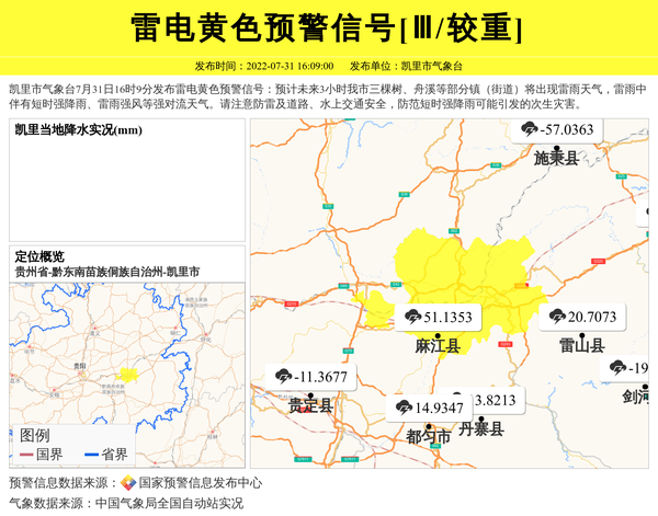 凯里市气象台7月31日16时9分发布雷电黄色预警信号:预计未来3小时我市三棵树、舟溪等部分镇(街道)将出现雷雨天气,雷雨中伴有短时强降雨、雷雨强风等强对流天气。请注意防雷及道路、水上交通安全,防范短时强降雨可能引发的次生灾害。 信息来源:国家预警信息发布中心; 发布单位:凯里市气象台。
