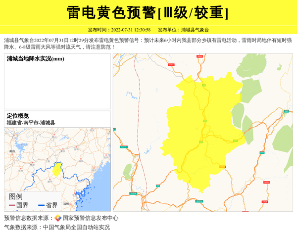 浦城县气象台2022年07月31日12时29分发布雷电黄色预警信号:预计未来6小时内我县部分乡镇有雷电活动,雷雨时局地伴有短时强降水、6-8级雷雨大风等强对流天气,请注意防范! 信息来源:国家预警信息发布中心; 发布单位:浦城县气象台。