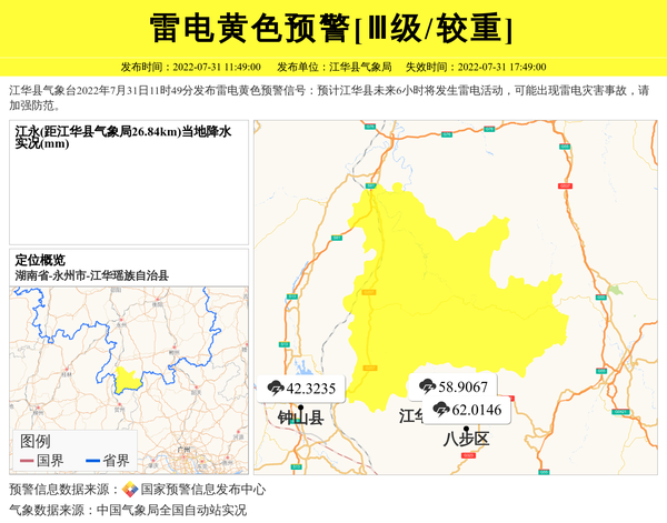 江华县气象台2022年7月31日11时49分发布雷电黄色预警信号:预计江华县未来6小时将发生雷电活动,可能出现雷电灾害事故,请加强防范。 信息来源:国家预警信息发布中心; 发布单位:江华县气象局。