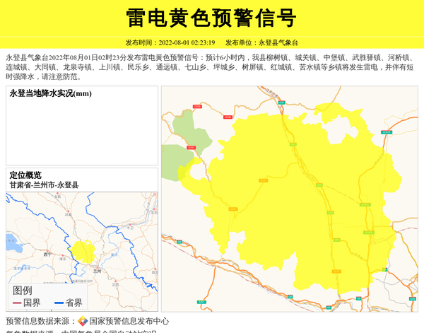 永登县气象台2022年08月01日02时23分发布雷电黄色预警信号:预计6小时内,我县柳树镇、城关镇、中堡镇、武胜驿镇、河桥镇、连城镇、大同镇、龙泉寺镇、上川镇、民乐乡、通远镇、七山乡、坪城乡、树屏镇、红城镇、苦水镇等乡镇将发生雷电,并伴有短时强降水,请注意防范。 信息来源:国家预警信息发布中心; 发布单位:永登县气象台。