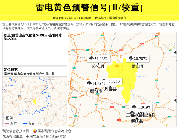 雷山县气象台7月31日15时31分发布雷电黄色预警信号:预计未来3小时我县望丰、西江、郎德等乡镇将出现雷雨天气,雷雨中可能伴有短时强降水、大风等强对流天气,请注意防范。 信息来源:国家预警信息发布中心; 发布单位:雷山县气象台。