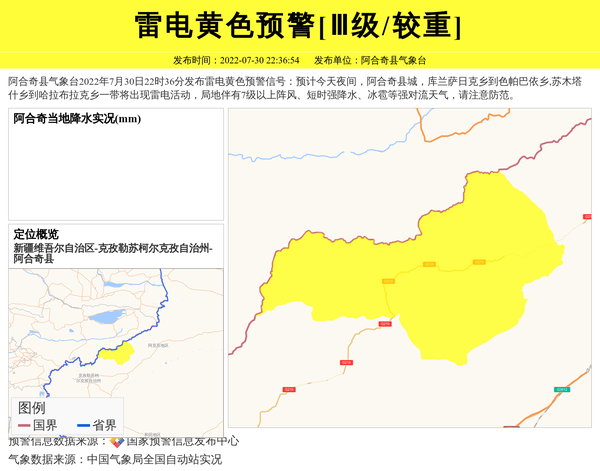 阿合奇县气象台2022年7月30日22时36分发布雷电黄色预警信号:预计今天夜间,阿合奇县城,库兰萨日克乡到色帕巴依乡,苏木塔什乡到哈拉布拉克乡一带将出现雷电活动,局地伴有7级以上阵风、短时强降水、冰雹等强对流天气,请注意防范。 信息来源:国家预警信息发布中心; 发布单位:阿合奇县气象台。