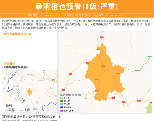 临翔区气象台2022年7月31日13时20分发布暴雨橙色预警信号:过去2小时,我区博尚镇坝密河降水量达41.8毫米,预计未来3小时,我区降水将持续,博尚镇累计降雨量将达50毫米以上,局地伴有雷电、大风、冰雹等强对流天气。强降雨易引发山洪、滑坡、泥石流等灾害,地质灾害气象风险等级较高,需注意加强防范。 信息来源:国家预警信息发布中心; 发布单位:临翔区气象台。
