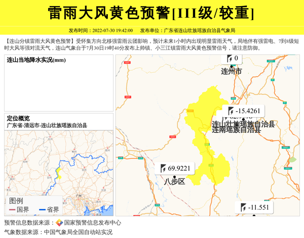 【连山分镇雷雨大风黄色预警】受怀集方向北移强雷雨云团影响,预计未来1小时内出现明显雷雨天气,局地伴有强雷电、7到8级短时大风等强对流天气,连山气象台于7月30日19时40分发布上帅镇、小三江镇雷雨大风黄色预警信号,请注意防御。 信息来源:国家预警信息发布中心; 发布单位:广东省连山壮族瑶族自治县气象局。