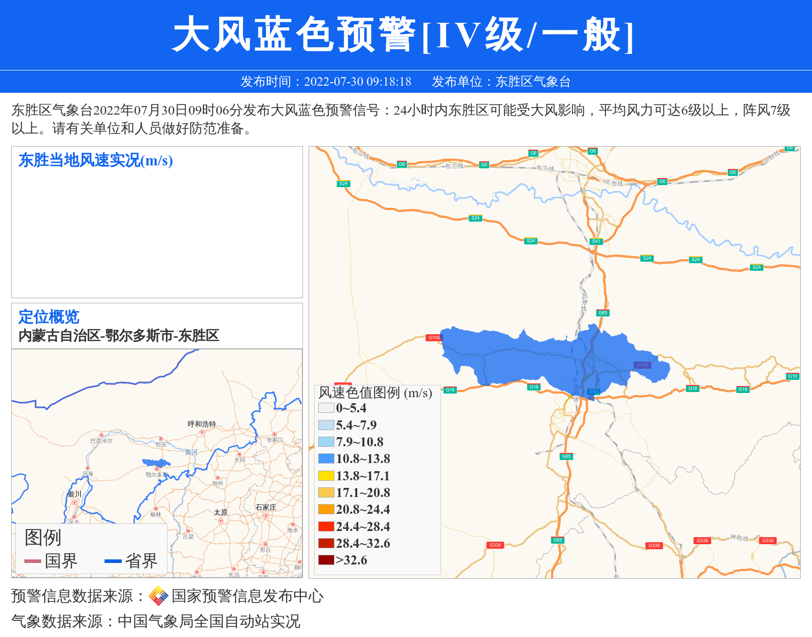 东胜区气象台2022年07月30日09时06分发布大风蓝色预警信号:24小时内东胜区可能受大风影响,平均风力可达6级以上,阵风7级以上。请有关单位和人员做好防范准备。 信息来源:国家预警信息发布中心; 发布单位:东胜区气象台。