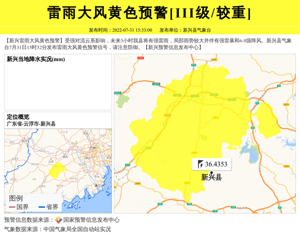新兴县气象台发布雷雨大风黄色预警[III级/较重]