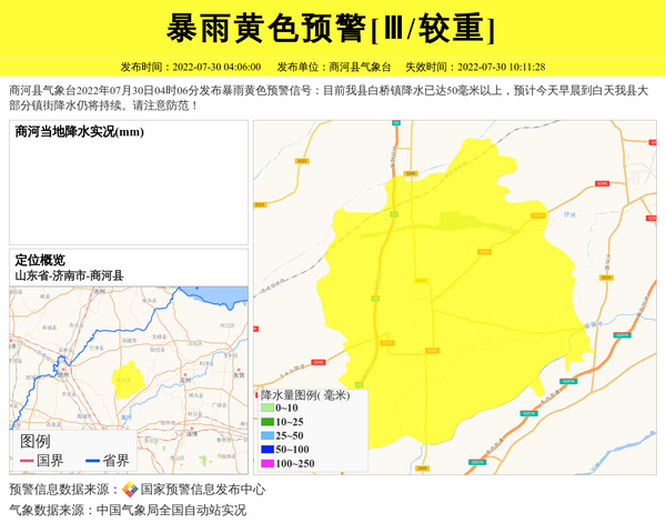 商河县气象台2022年07月30日04时06分发布暴雨黄色预警信号:目前我县白桥镇降水已达50毫米以上,预计今天早晨到白天我县大部分镇街降水仍将持续。请注意防范! 信息来源:国家预警信息发布中心; 发布单位:商河县气象台。