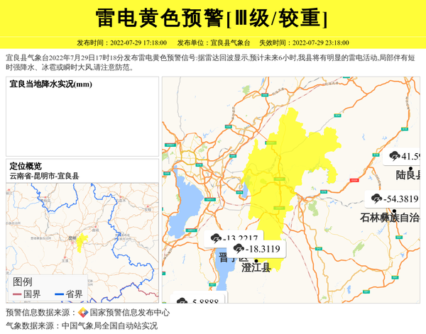 宜良县气象台2022年7月29日17时18分发布雷电黄色预警信号:据雷达回波显示,预计未来6小时,我县将有明显的雷电活动,局部伴有短时强降水、冰雹或瞬时大风,请注意防范。 信息来源:国家预警信息发布中心; 发布单位:宜良县气象台。