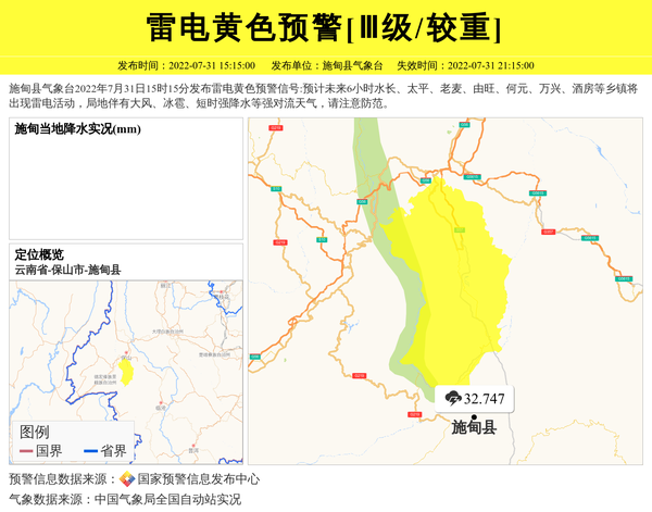 施甸县气象台2022年7月31日15时15分发布雷电黄色预警信号:预计未来6小时水长、太平、老麦、由旺、何元、万兴、酒房等乡镇将出现雷电活动,局地伴有大风、冰雹、短时强降水等强对流天气,请注意防范。 信息来源:国家预警信息发布中心; 发布单位:施甸县气象台。