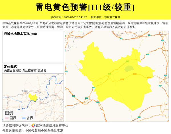 凉城县气象台2022年07月29日22时40分发布雷电黄色预警信号:6小时内凉城县可能发生雷电活动,局部地区伴有短时强降水、雷暴大风、冰雹等强对流天气,可能造成雷电、洪涝、城市内涝等灾害事故。请有关单位和人员做好防范准备。 信息来源:国家预警信息发布中心; 发布单位:凉城县气象台。