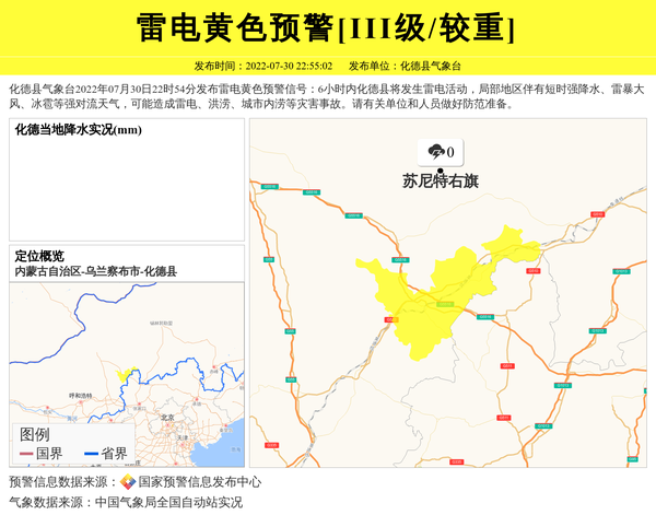 化德县气象台2022年07月30日22时54分发布雷电黄色预警信号:6小时内化德县将发生雷电活动,局部地区伴有短时强降水、雷暴大风、冰雹等强对流天气,可能造成雷电、洪涝、城市内涝等灾害事故。请有关单位和人员做好防范准备。 信息来源:国家预警信息发布中心; 发布单位:化德县气象台。