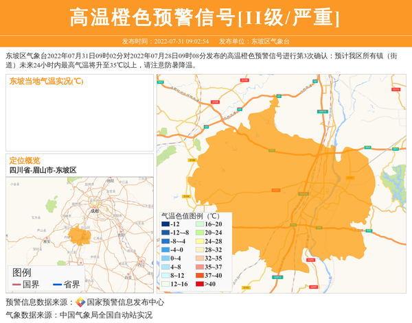 东坡区气象台2022年07月31日09时02分对2022年07月28日09时08分发布的高温橙色预警信号进行第3次确认:预计我区所有镇(街道)未来24小时内最高气温将升至35℃以上,请注意防暑降温。 信息来源:国家预警信息发布中心; 发布单位:东坡区气象台。