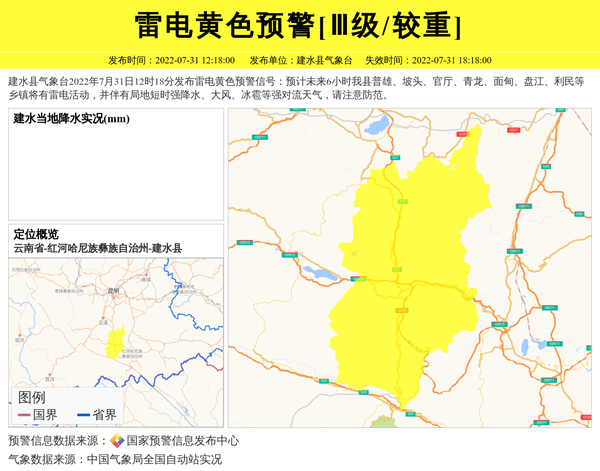 建水县气象台2022年7月31日12时18分发布雷电黄色预警信号:预计未来6小时我县普雄、坡头、官厅、青龙、面甸、盘江、利民等乡镇将有雷电活动,并伴有局地短时强降水、大风、冰雹等强对流天气,请注意防范。 信息来源:国家预警信息发布中心; 发布单位:建水县气象台。