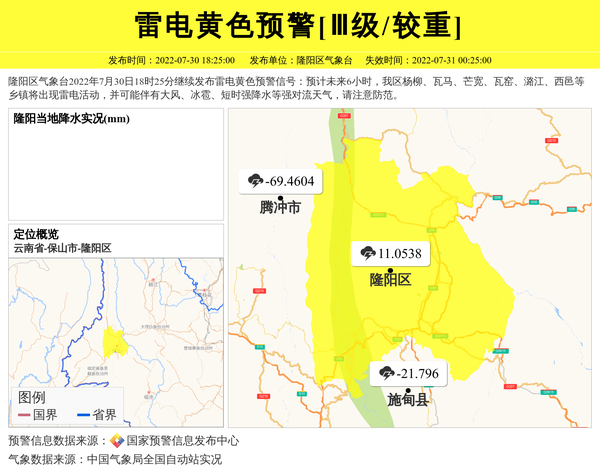 隆阳区气象台2022年7月30日18时25分继续发布雷电黄色预警信号:预计未来6小时,我区杨柳、瓦马、芒宽、瓦窑、潞江、西邑等乡镇将出现雷电活动,并可能伴有大风、冰雹、短时强降水等强对流天气,请注意防范。 信息来源:国家预警信息发布中心; 发布单位:隆阳区气象台。