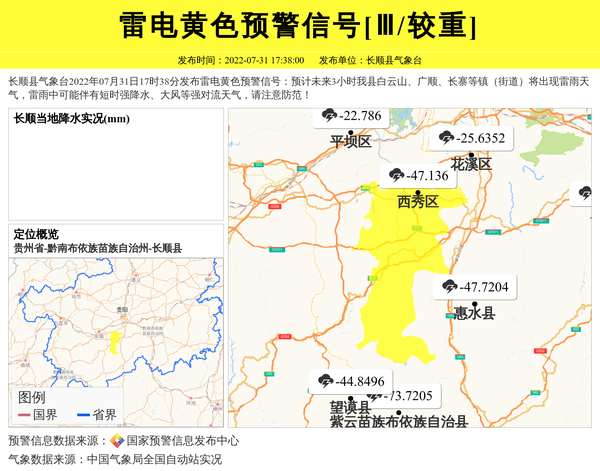 长顺县气象台2022年07月31日17时38分发布雷电黄色预警信号:预计未来3小时我县白云山、广顺、长寨等镇(街道)将出现雷雨天气,雷雨中可能伴有短时强降水、大风等强对流天气,请注意防范! 信息来源:国家预警信息发布中心; 发布单位:长顺县气象台。
