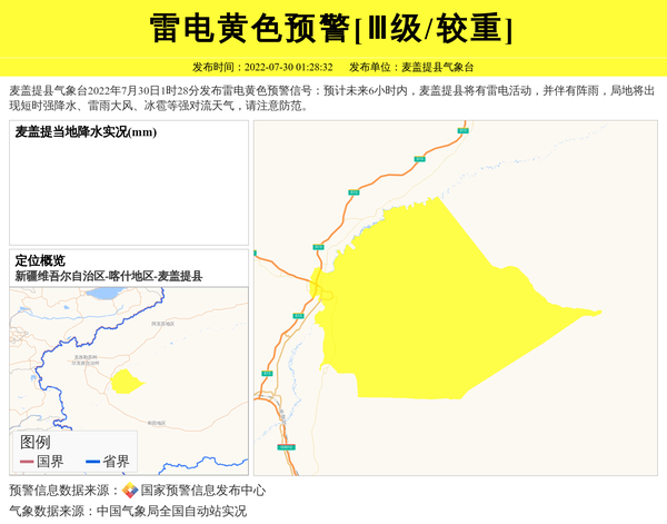 麦盖提县气象台2022年7月30日1时28分发布雷电黄色预警信号:预计未来6小时内,麦盖提县将有雷电活动,并伴有阵雨,局地将出现短时强降水、雷雨大风、冰雹等强对流天气,请注意防范。 信息来源:国家预警信息发布中心; 发布单位:麦盖提县气象台。
