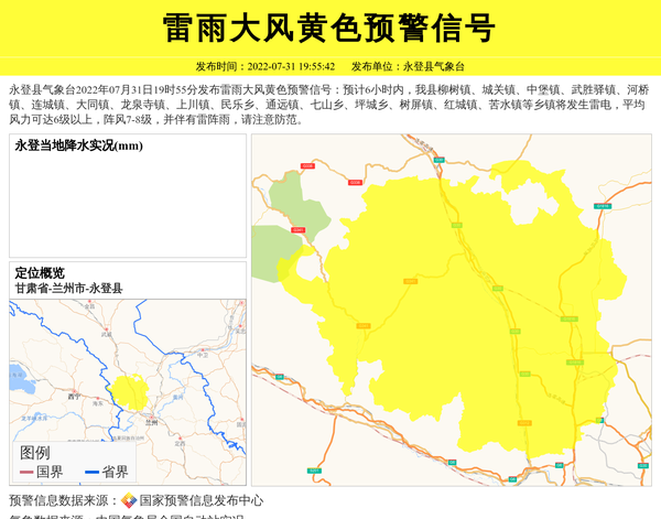 永登县气象台2022年07月31日19时55分发布雷雨大风黄色预警信号:预计6小时内,我县柳树镇、城关镇、中堡镇、武胜驿镇、河桥镇、连城镇、大同镇、龙泉寺镇、上川镇、民乐乡、通远镇、七山乡、坪城乡、树屏镇、红城镇、苦水镇等乡镇将发生雷电,平均风力可达6级以上,阵风7-8级,并伴有雷阵雨,请注意防范。 信息来源:国家预警信息发布中心; 发布单位:永登县气象台。
