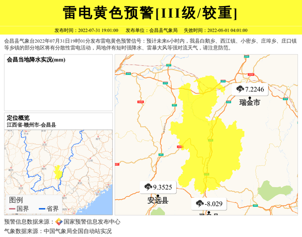 会昌县气象台2022年07月31日19时01分发布雷电黄色预警信号:预计未来6小时内,我县白鹅乡、西江镇、小密乡、庄埠乡、庄口镇等乡镇的部分地区将有分散性雷电活动,局地伴有短时强降水、雷暴大风等强对流天气,请注意防范。 信息来源:国家预警信息发布中心; 发布单位:会昌县气象局。