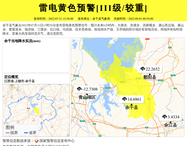 余干县气象台2022年07月31日15时58分发布雷电黄色预警信号:预计未来6小时内,大塘乡、东塘乡、洪家嘴乡、康山垦总场、康山乡、鹭鸶港乡、瑞洪镇、三塘乡、石口镇、乌泥镇、信丰垦殖场、渔池湖水产场、玉亭镇的部分地区有雷电活动,局地伴有短时强降水、雷暴大风等强对流天气,请注意防范。 信息来源:国家预警信息发布中心; 发布单位:余干县气象局。
