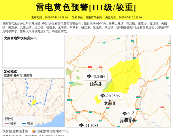 龙南市气象台2022年07月31日13时21分发布雷电黄色预警信号:预计未来6小时内,安基山林场、程龙镇、东江乡、渡江镇、关西镇、夹湖乡、九连山镇、里仁镇、临塘乡、龙南镇、南亨乡、桃江乡、汶龙镇、武当镇、杨村镇的部分地区有雷电活动,局地伴有短时强降水、雷暴大风等强对流天气,请注意防范。 信息来源:国家预警信息发布中心; 发布单位:龙南市气象局。