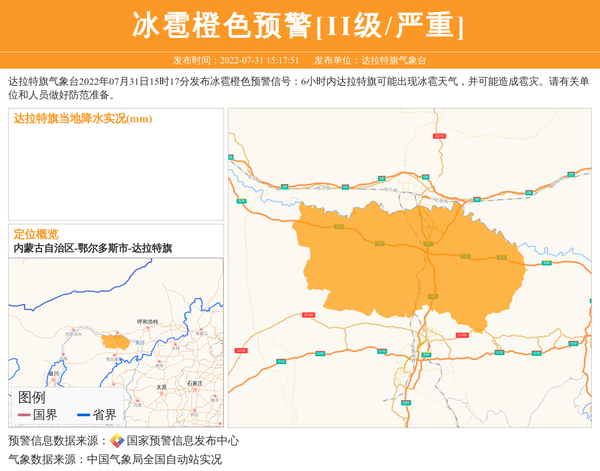 达拉特旗气象台2022年07月31日15时17分发布冰雹橙色预警信号:6小时内达拉特旗可能出现冰雹天气,并可能造成雹灾。请有关单位和人员做好防范准备。 信息来源:国家预警信息发布中心; 发布单位:达拉特旗气象台。