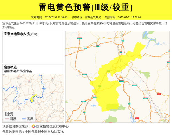 宜章县气象台2022年7月31日11时50分发布雷电黄色预警信号:预计宜章县未来6小时将发生雷电活动,可能出现雷电灾害事故,请加强防范。 信息来源:国家预警信息发布中心; 发布单位:宜章县气象局。