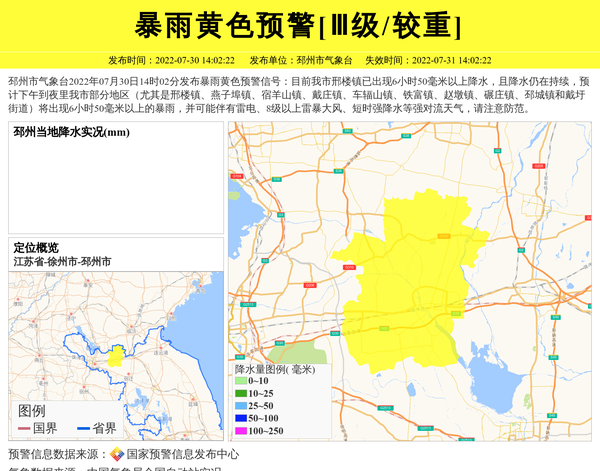 邳州市气象台2022年07月30日14时02分发布暴雨黄色预警信号:目前我市邢楼镇已出现6小时50毫米以上降水,且降水仍在持续,预计下午到夜里我市部分地区(尤其是邢楼镇、燕子埠镇、宿羊山镇、戴庄镇、车辐山镇、铁富镇、赵墩镇、碾庄镇、邳城镇和戴圩街道)将出现6小时50毫米以上的暴雨,并可能伴有雷电、8级以上雷暴大风、短时强降水等强对流天气,请注意防范。 信息来源:国家预警信息发布中心; 发布单位:邳州市气象台。