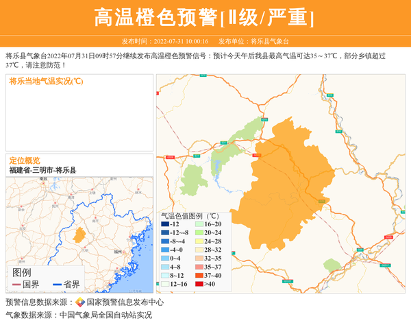 将乐县气象台2022年07月31日09时57分继续发布高温橙色预警信号:预计今天午后我县最高气温可达35~37℃,部分乡镇超过37℃,请注意防范! 信息来源:国家预警信息发布中心; 发布单位:将乐县气象台。