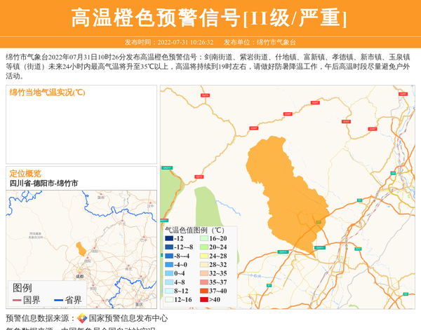 绵竹市气象台发布高温橙色预警信号[II级/严重]