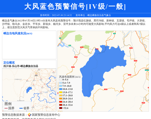 峨边县气象台2022年07月30日23时14分发布大风蓝色预警信号:预计我县红旗镇、黑竹沟镇、新林镇、五渡镇、毛坪镇、大堡镇、沙坪镇、勒乌乡、金岩乡、平等乡、新场乡、杨河乡、宜坪乡未来24小时内可能受大风影响,平均风力可达6级以上或者阵风7级以上,请注意防范大风天气带来的不利影响。 信息来源:国家预警信息发布中心; 发布单位:峨边彝族自治县气象台。