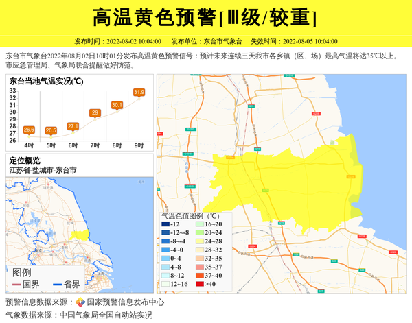 东台市气象台2022年08月02日10时01分发布高温黄色预警信号:预计未来连续三天我市各乡镇(区、场)最高气温将达35℃以上。市应急管理局、气象局联合提醒做好防范。 信息来源:国家预警信息发布中心; 发布单位:东台市气象台。