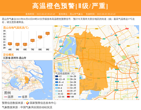 昆山市气象台2022年08月02日09时45分升级发布高温橙色预警信号:预计今天我市大部分地区的街道(镇)最高气温将达37℃左右,请注意防暑降温。 信息来源:国家预警信息发布中心; 发布单位:昆山市气象台。