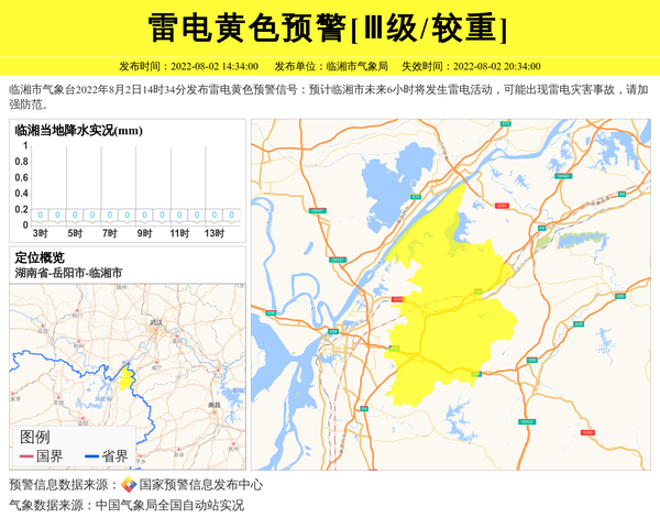 临湘市气象台2022年8月2日14时34分发布雷电黄色预警信号:预计临湘市未来6小时将发生雷电活动,可能出现雷电灾害事故,请加强防范。 信息来源:国家预警信息发布中心; 发布单位:临湘市气象局。
